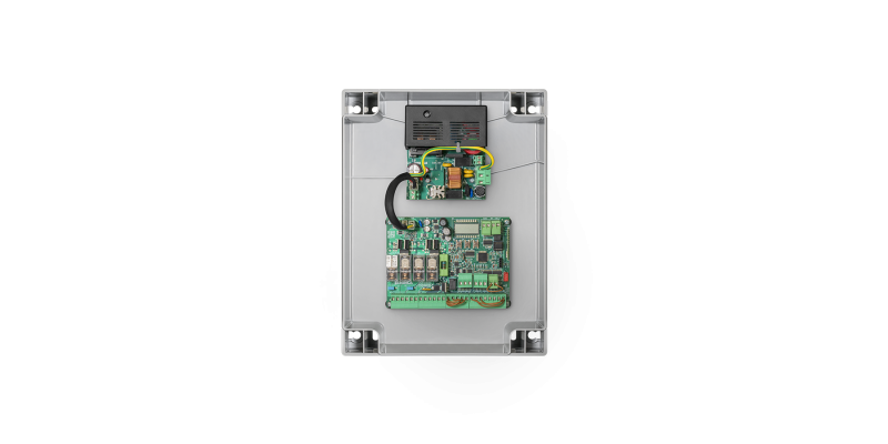 Integrated LCD display | Integrated radio receiver 433.92 MHz 64 codes and 3 encoding systems (Advanced Rolling Code, Rolling Code, Fixed Code | Removable terminal boards | Separate limit switch inputs for each motor | Open, close, step-by-step and pedestrian inputs | Separate opening-closing and closing photocell inputs | Stop input | Input for N.C. or 8K2 sensitive edge | Encoder Input for 24 Vdc hydraulic motors | Output for 12 Vdc electric lock | 2 outputs configurable as open gate indicator, second radio channel, courtesy light, zone light or photocell testing, flashing light, open gate alarm, NC input alarm | Output for connecting flashing light | Autoset of operating parameters | Separate electronic torque adjustment for each motor | Separate electronic speed adjustment for each motor | Anti-crushing safety through amperometric detection and encoder management | Separate slowdowns for each motor in opening and closing phases | Set up for connection to KNX systems via X.BE card (optional) | Designed for managing, configuring, diagnosing and updating firmware through the BeUP app, using the PRO.UP accessory | Advantouch system to configure parameters and manage radio transmitters | Number of manoeuvres | Programming access password | Maintenance warning | Built-in battery charger